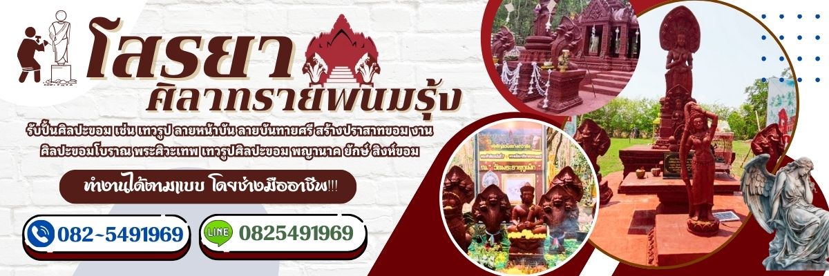ยินดีต้อนรับสู่ร้านโสรยาศิลาทรายพนมรุ้ง ผู้เชี่ยวชาญด้านการผลิตและจำหน่ายงานศิลปะขอม ที่เราภูมิใจนำเสนอผลงานที่มีคุณภาพสูงและทรงคุณค่า ทั้งปราสาทขอมโบราณ พญานาคขอม และงานประติมากรรมลายขอม